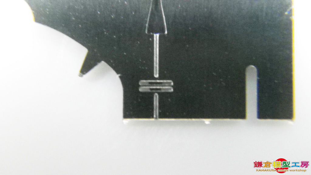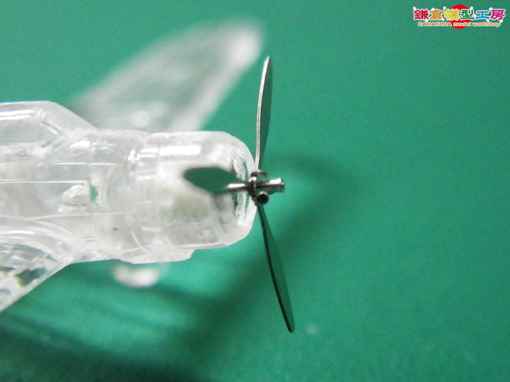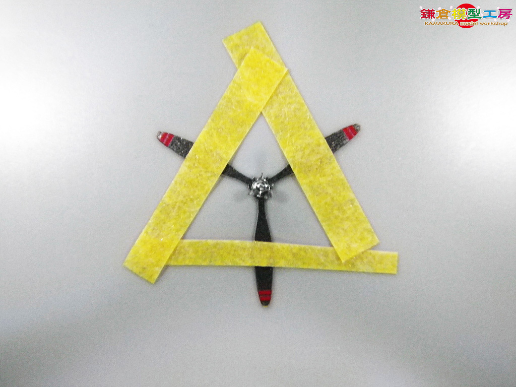 厚手のプラ板等に0.3mmの穴を開けましたら、プロペラパーツをカットしたシャフトで固定して下さい。プロペラが動かない様にマスキングテープで板に固定します。 ※シャフトパーツにはアルミの削り粉が付いてる場合がありますので、取り付ける前に柔らかいブラシ等できれいにして下さい。(ワイヤーブラシは形状の破損になりますので使用しないで下さい。) 先程垂直に曲げたバランスウエイトを、イラストの様な角度で曲げて下さい。その時、シャフトの皿部分をロックする形になりますので、バランスウエイトが外側に広がらない様にして下さい。