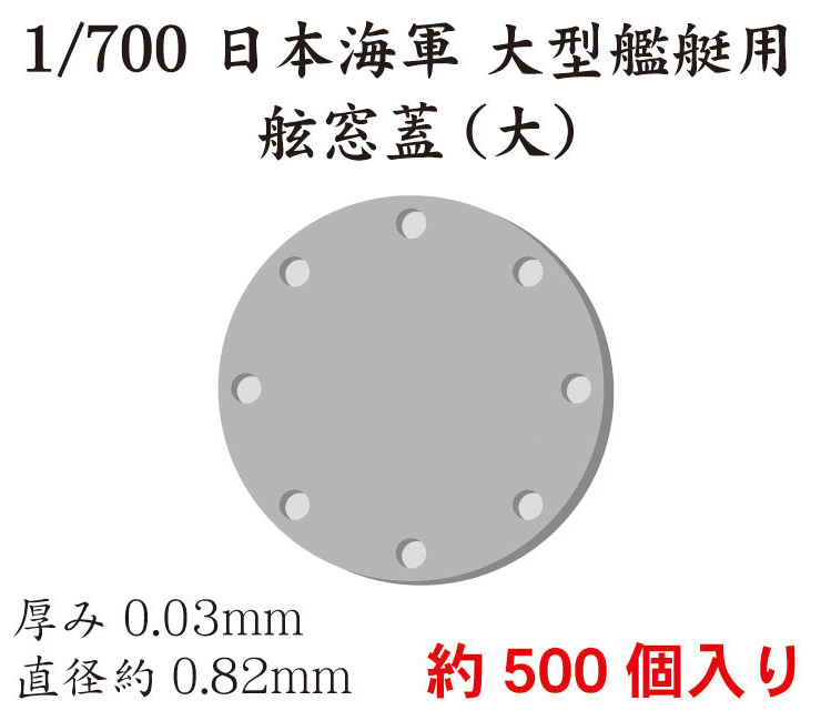 1/700 日本海軍 艦船模型用の舷窓蓋2種です。  第二次大戦後期の日本海軍艦艇の舷窓は、被弾による浸水防止や船体補強の目的の為、一部の舷窓を除き盲蓋にて閉塞されました。 1/700艦船模型用の舷窓蓋のエッチングパーツになります。 製品状態は切り離し済み、バラ状態での包装ですので、ゲート処理や台紙から外す等の手間がありません。 表面にはリベットのモールドがございますので表裏確認後、各種接着剤にて取り付けて下さい。 エッチングの板厚は0.03mmですので、1/700のスケール感を損なう事無く再現できます。 製品は、艦種の舷窓に合わせて2種類ご用意いたしました。(大)は戦艦、航空母艦、重巡洋艦等の大型艦艇に、(小)は駆逐艦や軽巡洋艦等の小型艦艇にご使用下さい。 ※本製品は非常に小さく軽い為、取り扱いには十分注意願います。