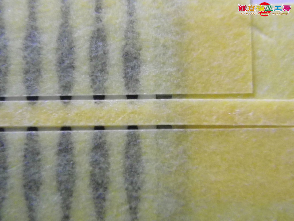 プロペラ内側の標識を塗装する場合は、二本警戒線の時と同様に枠を折り込み、二本警戒線用のスリットをマスキングして塗装して下さい。